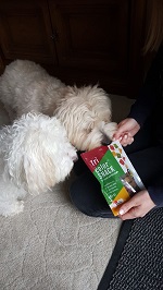 Die Krümel, die in der Tüte übrig bleiben, streuen wir, wenn die Packung leer ist, einfach über das übliche Futter, sodass die Hunde ein schmackhaftes Topping genießen können.